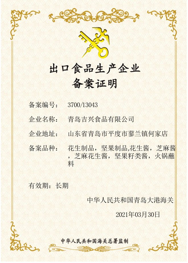 青島吉興食品有限公司,位于青島平度市,始建于2002年,是一家聚焦專注于花生深加工的食品企業(yè)。公司董事長于松魁先生從事花生產業(yè)深加工研究30余年,并將花生產業(yè)作為畢生事業(yè)。公司所生產花生醬研磨細度可以達到300目以上,擁有規(guī)范的現代化生產廠房、先進的技術生產線及專業(yè)管理團隊。